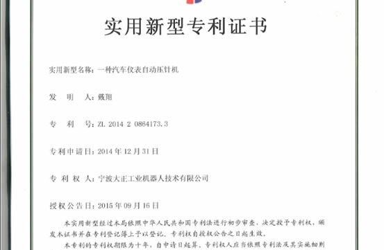 近日,寧波大正工業(yè)機(jī)器人技術(shù)有限公司憑借一種汽車儀表自動(dòng)壓針機(jī)(專利號(hào):ZL 2014 2 0864173.3);一種汽車儀表自動(dòng)壓針系統(tǒng)(專利號(hào)ZL 2014 2 0863870.7);一種汽車儀表自動(dòng)壓針裝置(專利號(hào):ZL 2014 2 0863918.4)三項(xiàng)技術(shù)榮獲“實(shí)用新型專利證書”。
